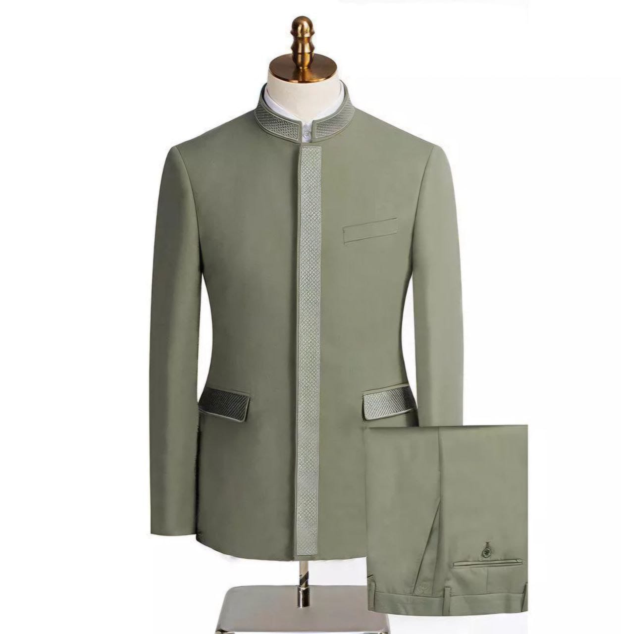 Men’s Khaki Green 2-Piece Suit with Chinese Collar – Effortlessly Stylish & Unique