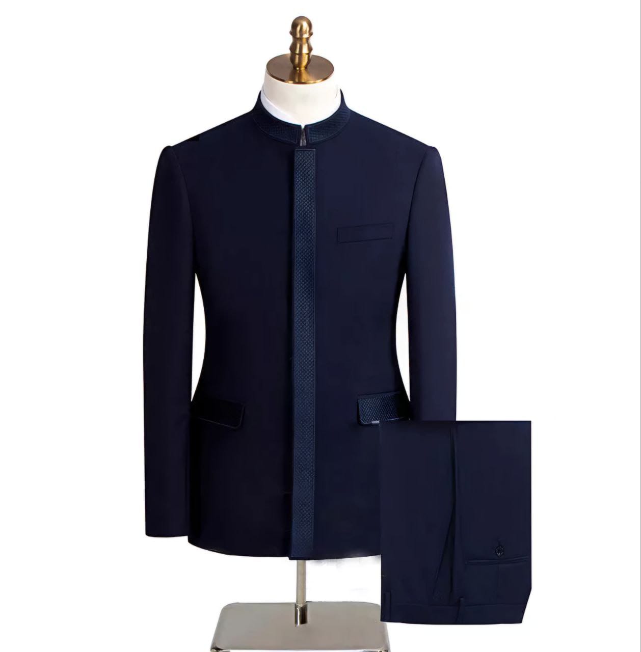 Men’s Navy Blue 2-Piece Suit with Chinese Collar – Bold, Modern Sophistication