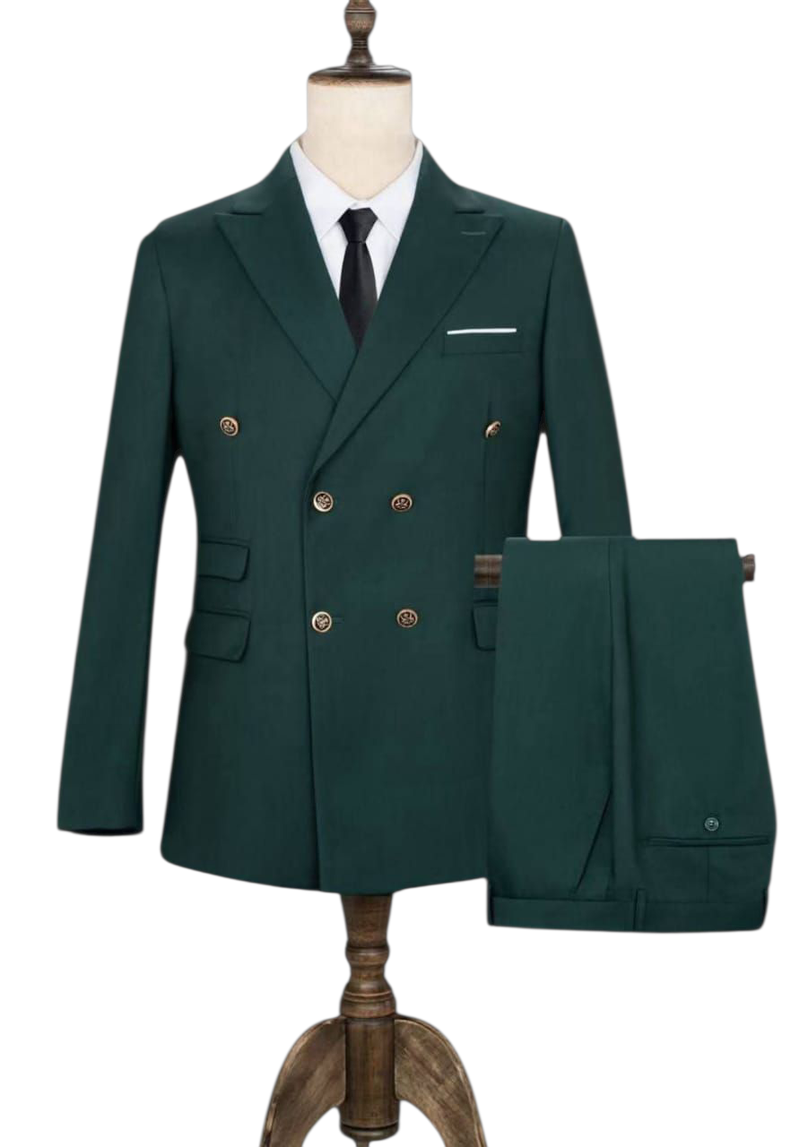 Elevate your style with this sophisticated green double-breasted suit, tailored for a sleek and modern fit. Designed with a sharp notched lapel, gold-toned buttons, and a matching pair of trousers, this suit exudes timeless elegance. Perfect for formal occasions, weddings, or high-profile events, it pairs seamlessly with a crisp white shirt and classic tie for a polished look.