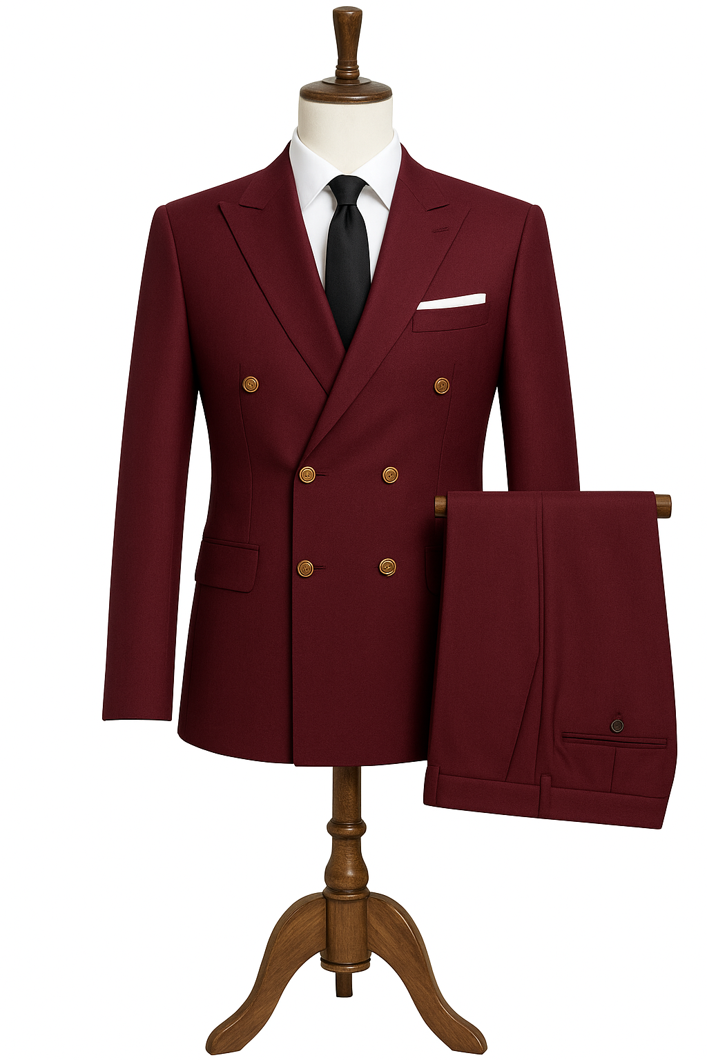 Turn heads in this maroon double-breasted suit, designed with a sleek, tailored fit and bold color that blends classic style with modern confidence. Perfect for making a strong fashion statement.