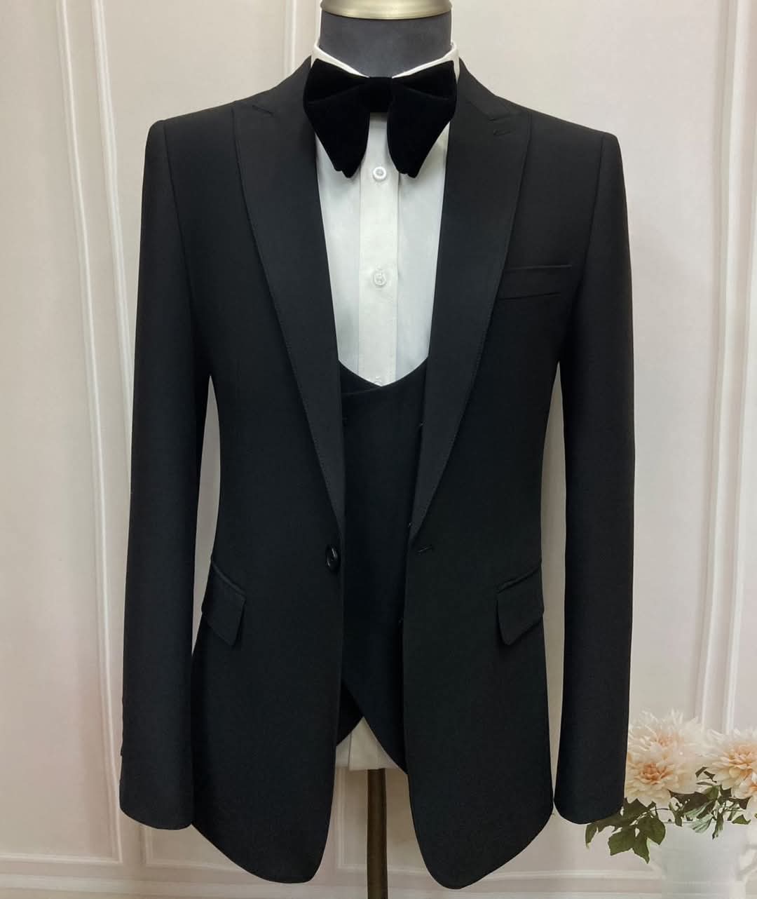 Exude sophistication with this refined three-piece formal suit, tailored for special occasions and stylish events. Featuring a sleek blazer, matching waistcoat, and classic white shirt, this ensemble is completed with a bold velvet bow tie for a sharp and timeless look. Ideal for weddings, galas, and formal gatherings.