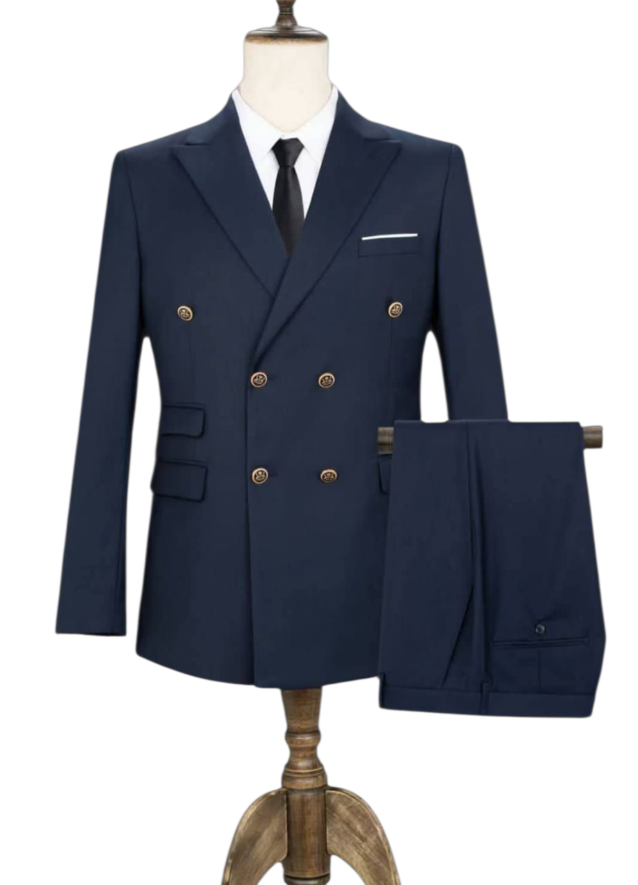 Elevate your style with this refined navy blue double-breasted suit, tailored for modern gentlemen who value timeless elegance. The blazer features a sharp peak lapel, six gold-tone buttons, flap pockets, and a classic welt chest pocket with a sleek pocket square accent. Paired with matching flat-front trousers, this suit is perfect for weddings, business meetings, and formal occasions. Designed to deliver sophistication, confidence, and comfort in every detail.