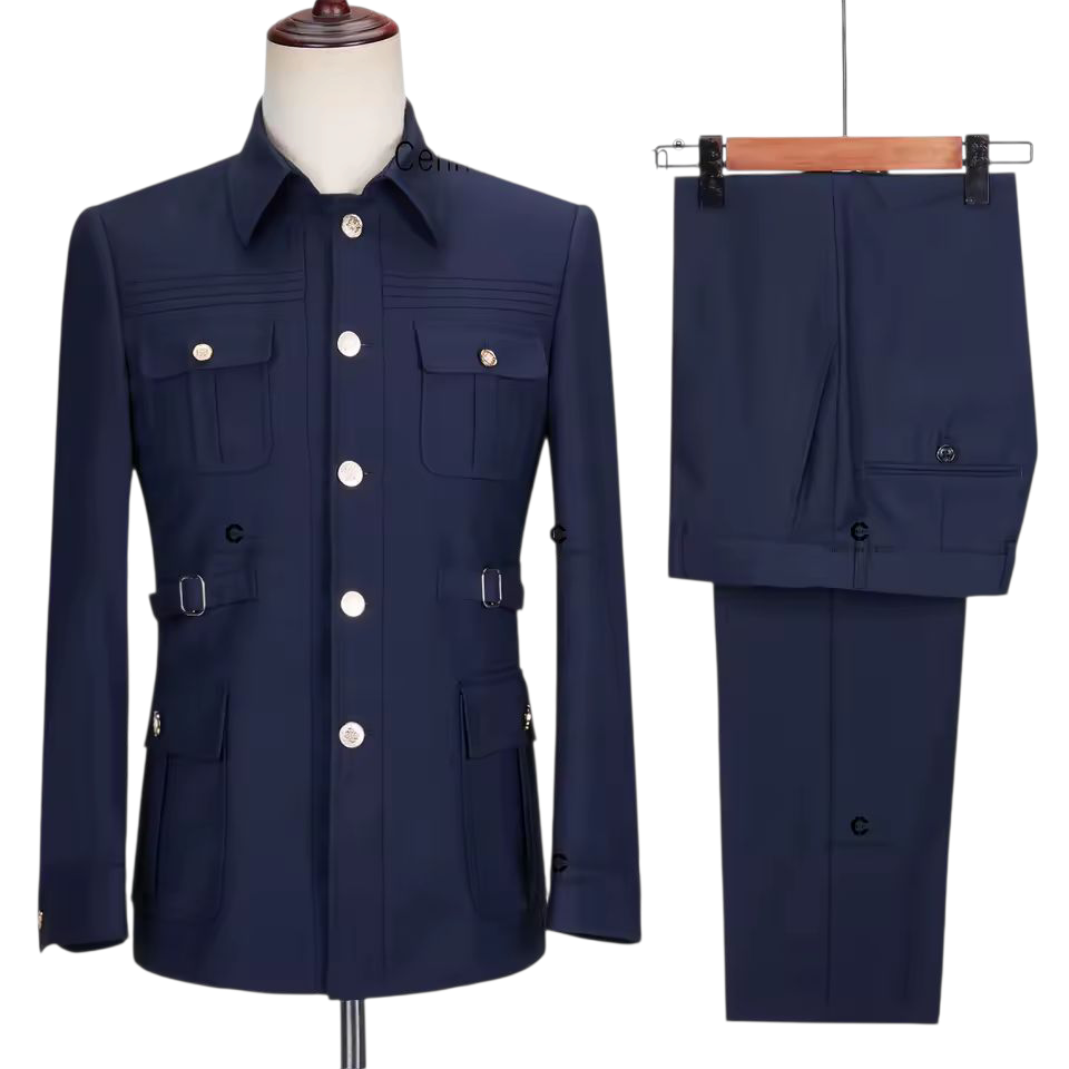 The jacket features four flap pockets, elegant gold-tone buttons, and side buckle adjusters that enhance the waistline for a sharp fit. With its signature safari collar and smart front detailing, this piece radiates confident leadership. The matching slim-cut trousers complete the polished look with a buttoned back pocket and cuffed hem finis