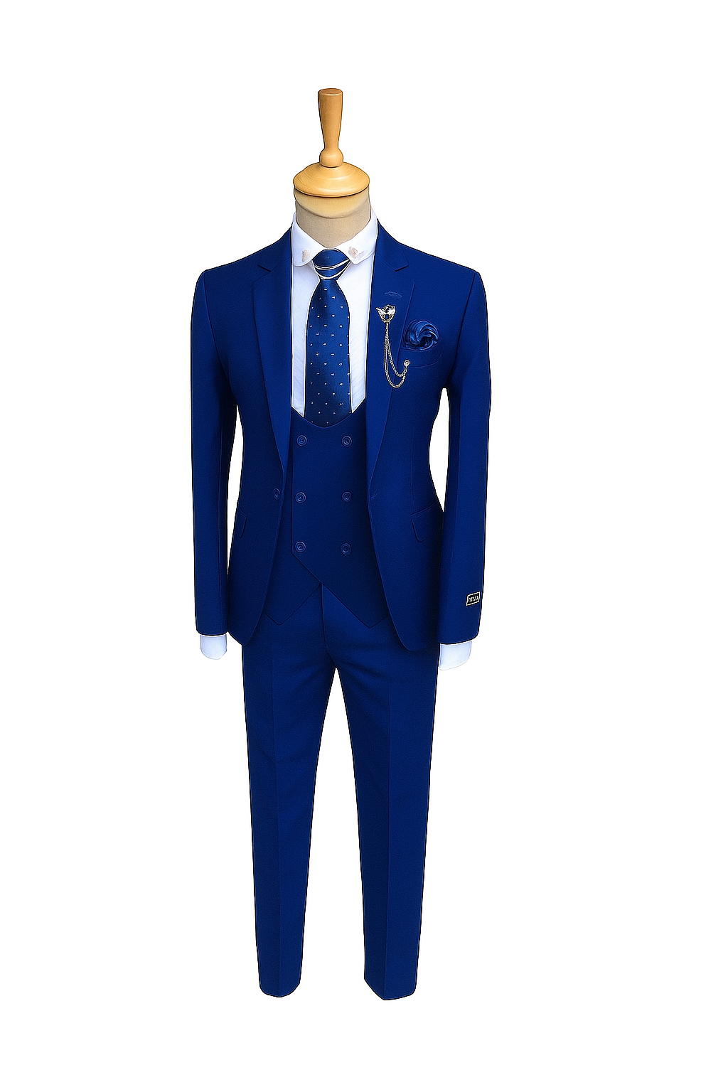 Make a bold entrance with this eye-catching royal blue three-piece suit. Tailored for the modern gentleman, it features a structured blazer, a sleek double-breasted waistcoat, and slim-fit trousers. Accented with a coordinated polka dot tie, elegant lapel chain, and matching pocket square, this ensemble brings together style and sophistication—ideal for weddings, formal events, or upscale evenings.